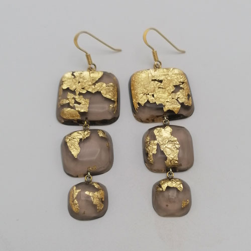 Schicke Statement Ohrhänger braun mit Goldmetalleinschluss, Fischerhaken Sterlingsilber vergoldet. Ein elegantes Leichtgewicht, bestehend aus 3 verschieden großen handgeschliffenen Acrylglas-Elementen in abgerundeter quadratischer Form mit 5 Gramm pro Stück