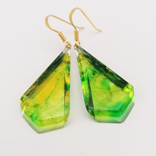 Dekorative Ohrhänger in facettierter Drachenform coloriert in grün- gelben Farbnuancen mit Fischerhaken Sterlingsilber vergoldet